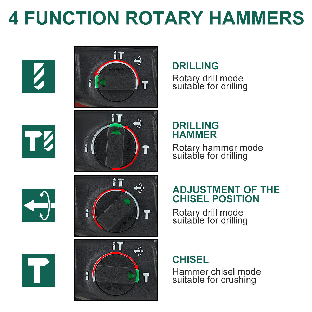 • 4 funciones en 1: Taladro, Martillo perforador con y sin percusión, cincelado