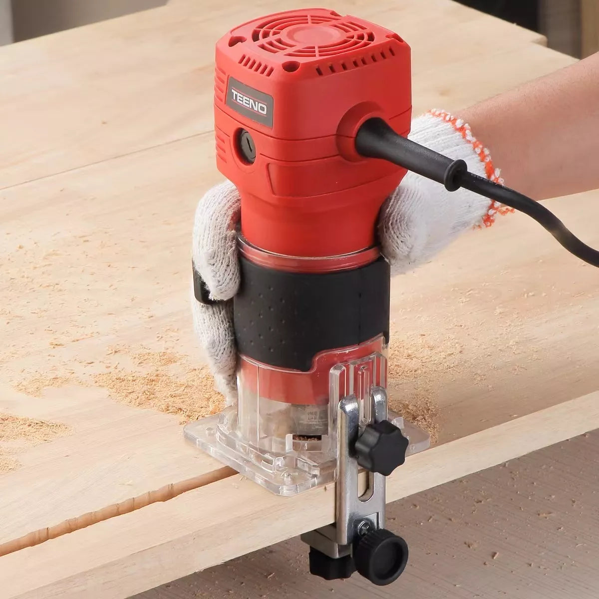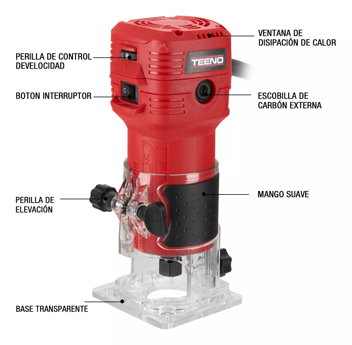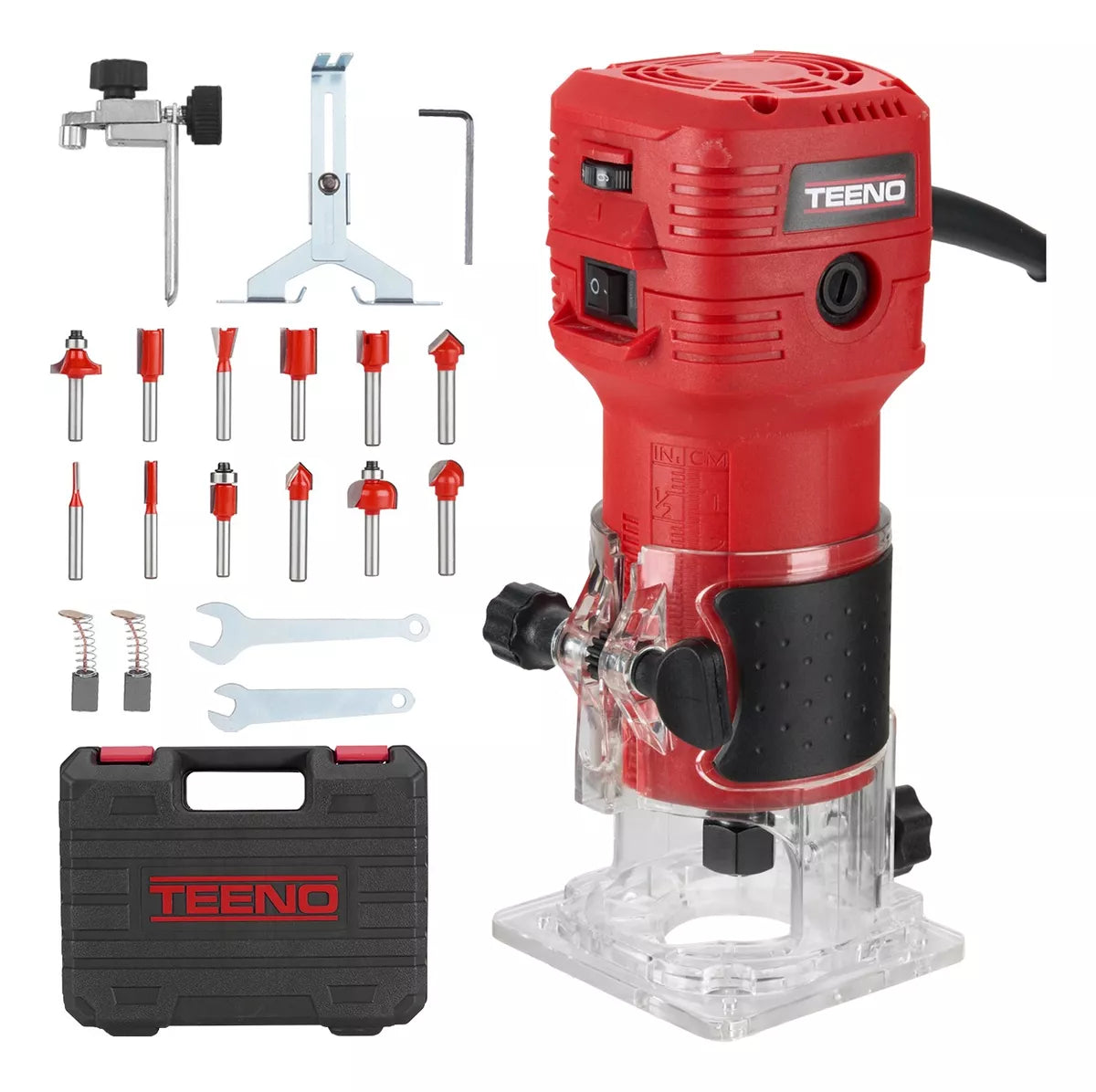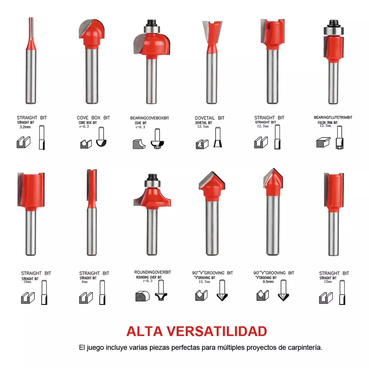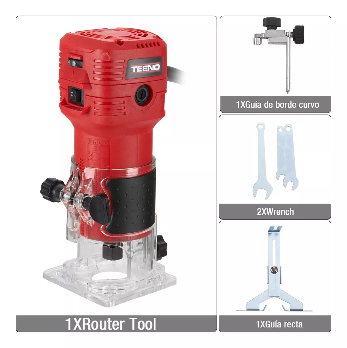 • Incluye: Guía de borde recto, guía de cojinete de rodillo, guía de plantilla, 2 llaves, cortador de fresado recto sin cojinete y 12 brocas.